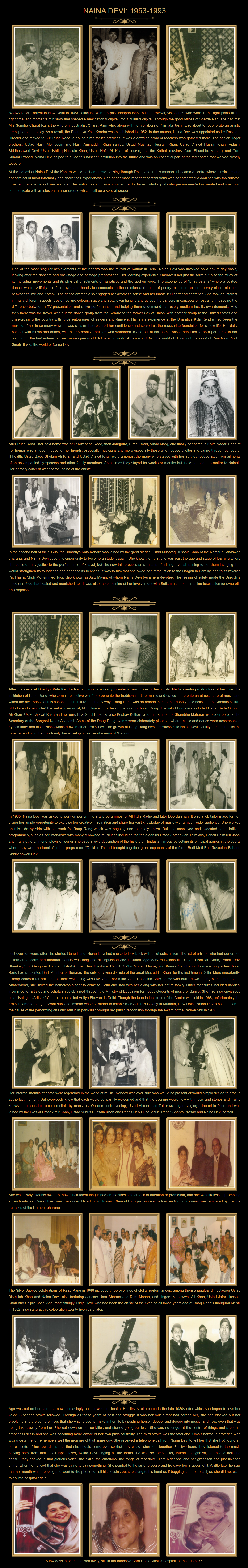 Age was not on her side and now increasingly neither was her health. Her first stroke came in the late 1980s after which she began to lose her voice. A second stroke followed. Through all those years of pain and struggle it was her music that had carried her, she had blocked out her problems and the compromises that she was forced to make in her life by pushing herself deeper and deeper into music: and now, even that was being taken away from her. She cut down on her activities and started going out less. She was no longer at the centre of things and a certain emptiness set in and she was becoming more aware of her own physical frailty. The third stroke was the fatal one. Uma Sharma, a protégée who was a dear friend, remembers well the morning of that same day. She received a telephone call from Naina Devi to tell her that she had found an old cassette of her recordings and that she should come over so that they could listen to it together. For two hours they listened to the music playing back from that small tape player, Naina Devi singing all the forms she was so famous for, thumri and ghazal, dadra and holi and chaiti….they soaked in that glorious voice, the skills, the emotions, the range of repertoire. That night she and her grandson had just finished dinner when he noticed that she was trying to say something. She pointed to the jar of glucose and he gave her a spoon of it. A little later he saw that her mouth was drooping and went to the phone to call his cousins but she clung to his hand as if begging him not to call, as she did not want to go into hospital again.