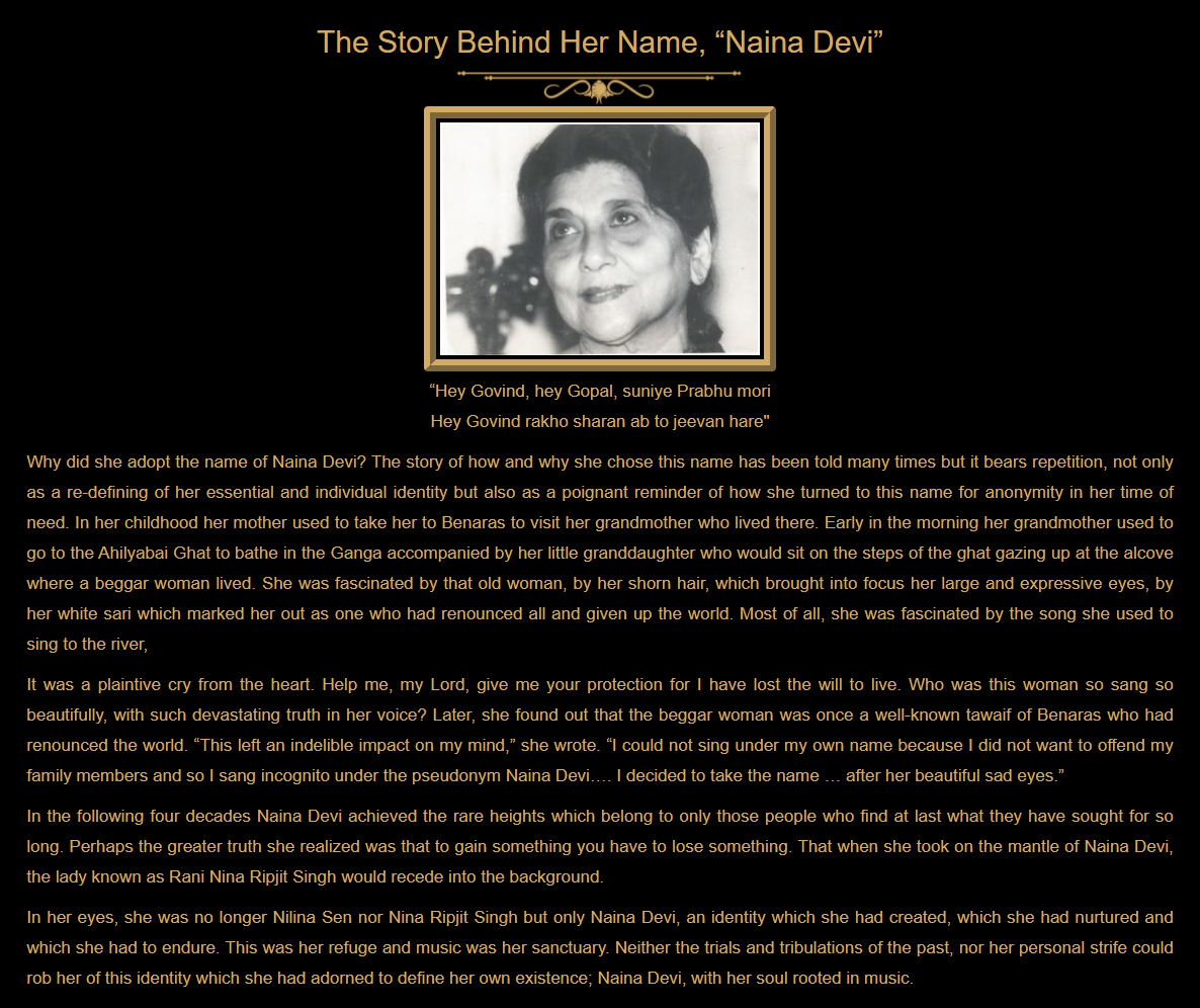 In her eyes, she was no longer Nilina Sen nor Nina Ripjit Singh but only Naina Devi, an identity which she had created, which she had nurtured and which she had to endure. This was her refuge and music was her sanctuary. Neither the trials and tribulations of the past, nor her personal strife could rob her of this identity which she had adorned to define her own existence; Naina Devi, with her soul rooted in music.